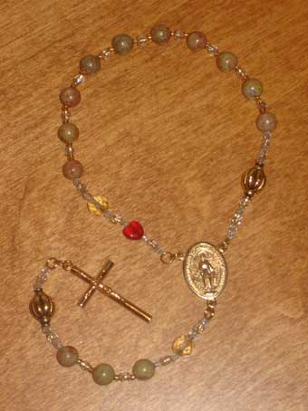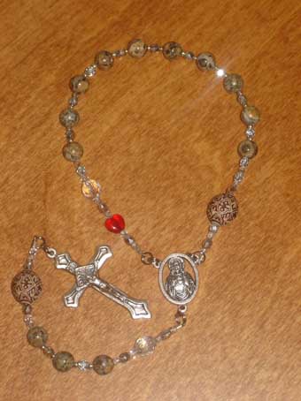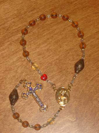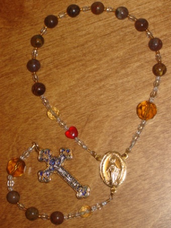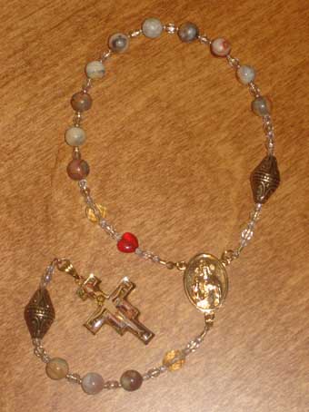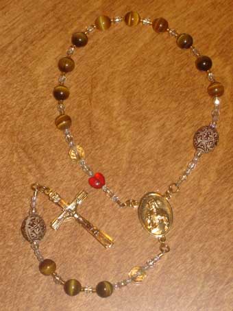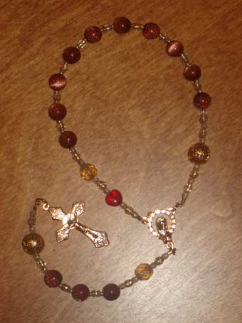 "Mother of Divine Grace":goldstone (brown with gold sparkles throughout) with hollow gold-tone paters