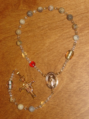 crazy lace agate with gold-speckled clear glass paters and enameled 'San Damiano' cross
